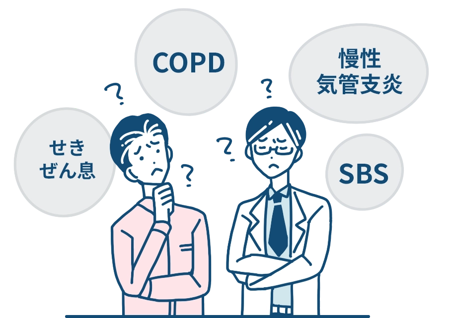 8週間以上続く長引く咳を「慢性咳嗽」といいます。原因となる主な病気には、咳ぜん息、ぜん息、アトピー咳嗽、慢性閉塞性肺疾患(COPD)などがあります。